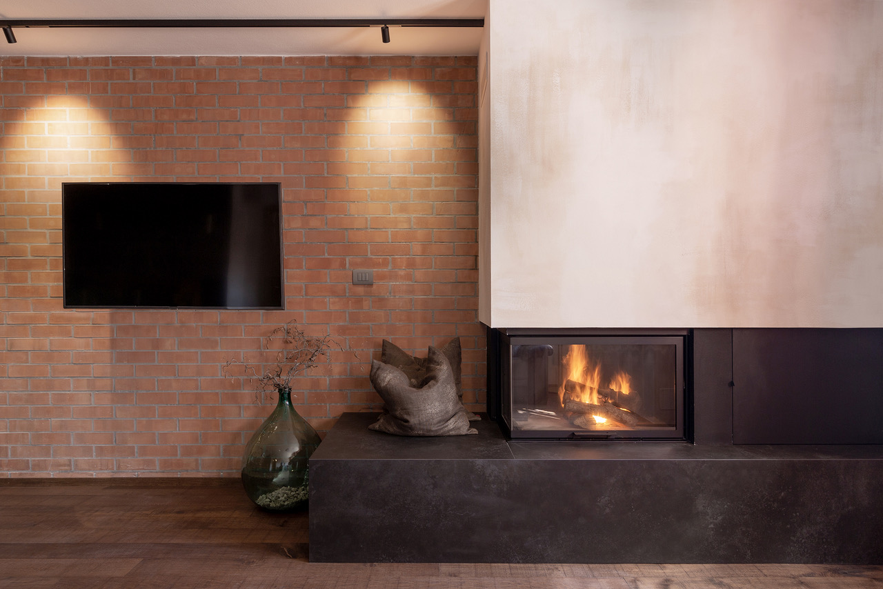 Inizialmente il progetto si configurava in maniera piuttosto differente, ma è stato fin da subito chiara la necessità di far si che il camino, zona conviviale e di relax, diventasse il fulcro dell’ambiente, e con l’esigenza di chiuderlo per rispondere alla normativa attuale abbiamo realizzato un camino dalle linee contemporanee che andasse in netto contrasto con il recupero degli arredi preesistenti, composto da un ampio basamento rivestito con un’unica lastra di grès di grande formato che all’occorrenza può configurarsi come seduta.
